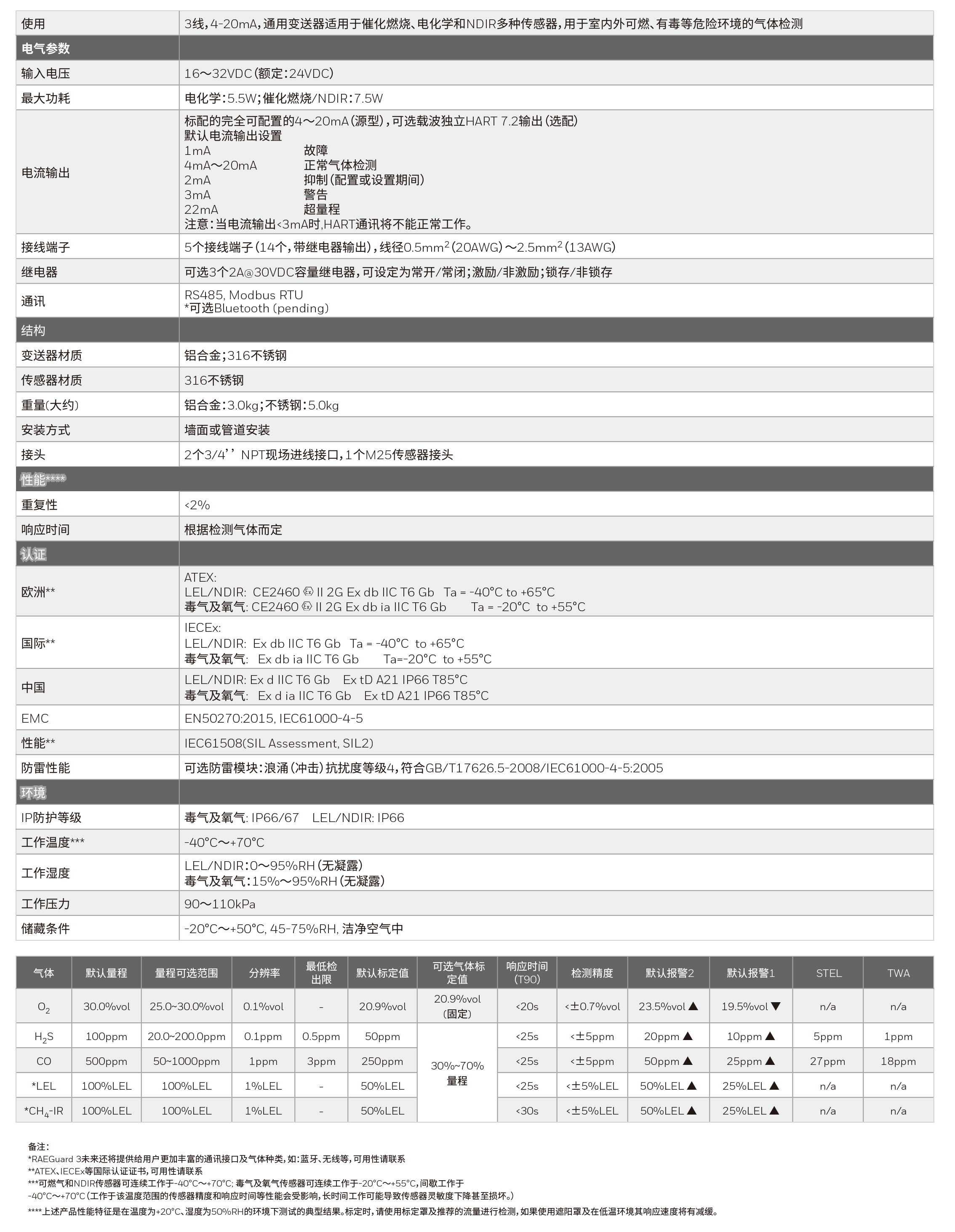 RAEGuard 3系列是拥有*、代表未来技术发展的Honeywell有毒有害气体探测器的代表之作,为用户提供更安全、更稳定、更可靠、更有效的现场变送器,可应用于室内、室外等危险环境中,实时监测环境中危害气体的危险程度,快速、有效保护安装现场和生产人员的安全。RAEGuard 3的核心-传感器经过严格筛选、优中选优,确保变送器始终能可靠稳定工作。可燃气检测采用长寿命(>5年)、高抗中毒技术催化燃烧传感器技术,有毒及氧气检测应用多种补偿电化学传感器技术,尤其是氧气探测器可免零点(氮气)标定,同时长寿命、抗中毒、无需氧气的NDIR红外检测技术让RAEGuard 3可应用于更广泛、更恶劣的气体检测环境。
